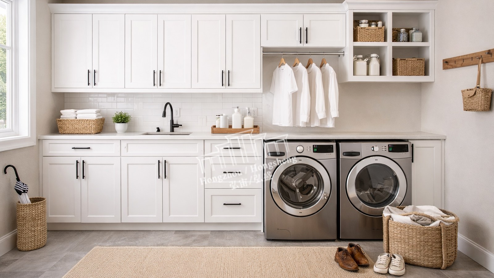 Customizable cabinets beside the washer, wall-mounted storage, and folding stations.