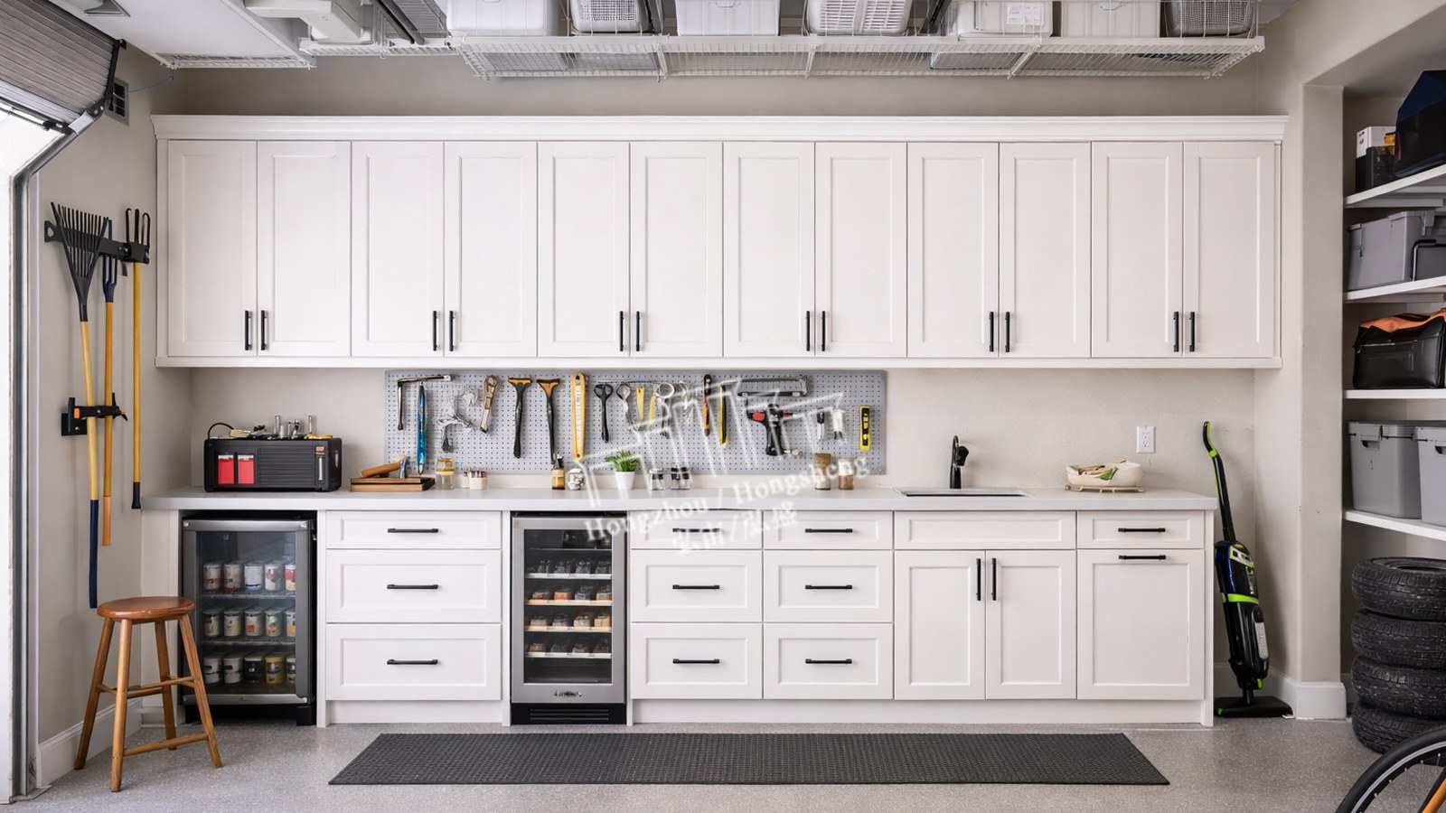 Heavy-duty materials and hardware support storage of tools and equipment.
